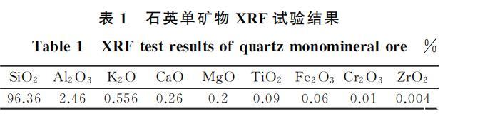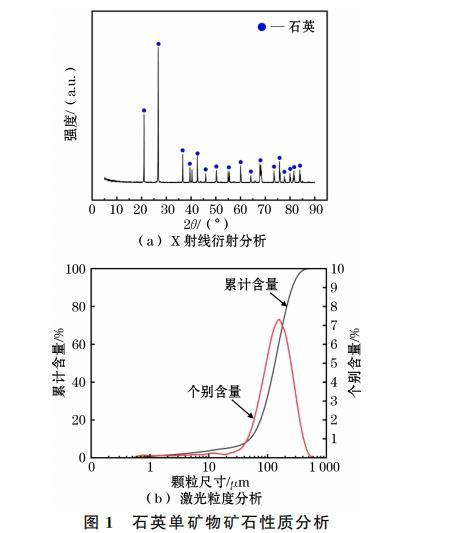 本试验所用的单矿物石英取自某矿厂,将制备后的石英单矿物样品进行X射线衍射(XRD)分析、X射线荧光光谱(XRF)分析和激光粒度分析,XRD的分析结果如图1(a)所示,XRF的分析结果见表1,粒度分析如图1(b)所示。从图1(a)可以看出,石英单矿物SiO₂峰强度以及密度最高,说明SiO₂占主导地位。从图1(b)可以看出,样品的中值粒径D₅₀达到了133.5μm,D₉₀则达到了264.3μm.综合上述矿物的纯度以及粒度,石英可满足后续单矿物试验以及机理分析的要求。