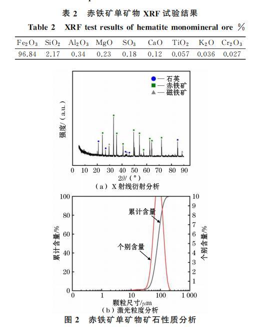 赤铁矿单矿物则取自某铁矿厂,将制备后的赤铁矿样品进行X射线衍射(XRD)分析、X射线荧光光谱(XRF)分析和激光粒度分析,XRD的分析结果如图2(a)所示,XRF的分析结果见表2,粒度分析如图2(b)所示。从图2(a)和表2可以看出,Fe₂O₃峰强度最高,含量达到了96.84%,另外含有少量的氧化物SiO₂、Al₂O₃等。从图2(b)可以看出,样品的中值粒径D₅₀达到了79.89μm,D₉₀则达到了123.2μm.综合上述纯度以及粒度,赤铁矿可满足后续单矿物试验的要求。
