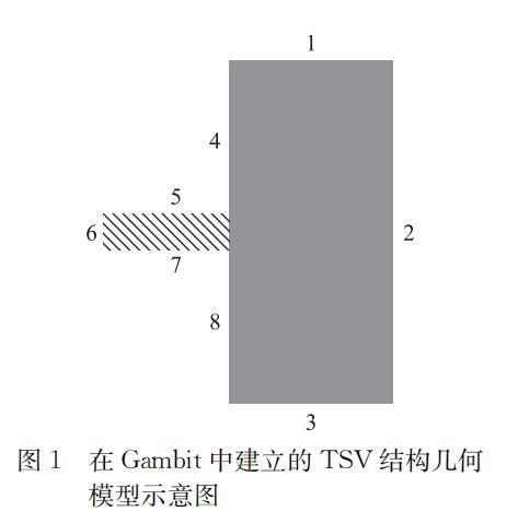 按照实际电镀液及样片的情况,在流体仿真软件中进行建模。主要分为2个部分:前处理软件Gambit中对平面模型的建立,Fluent中对流场进行具体解算。本文截取TSV轴对称结构的中心轴截面,建立二维分析模型,直接反应实际TSV的浸润过程。同时,基于对比实验考虑,忽略电镀液组分与被浸润表面化学反应造成的界面影响,并直接采用与电镀液物理性质基本相同的水作为液相组分。气相组分中采用理想不可压气体假设模拟正常大气压下的操作环境。建立的Fluent分析模型如图1所示。其中较小的矩形块代表TSV,4~8代表被润湿表面。初始情况下,所有被模拟区域为气相区域,之后液相从边界3以特定流速进入(除流速讨论单元,其余均设置为0.05 m/s),逐步润湿全部或局部表面,直至从边界1流出。具体设置为边界1为压力出口,2为对称边界,3为速度人口,4、5、6、7、8均为壁面边界条件。表面张力和接触角均采用实际测量值0.06 N/m,64°;重力加速度为9.81 m/s²,方向为竖直向下。