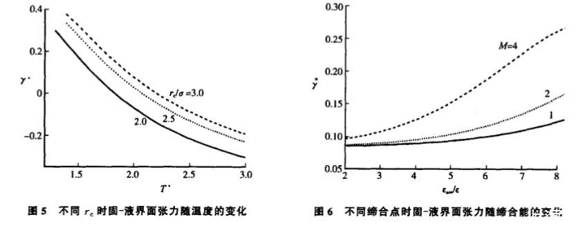 界面张力是化学化工领域非常重要的一个基本参数,其在本质上体现为界面区域分子指向体系内部的聚集趋势。影响界面张力的因素有很多,其中以温度和分子间相互作用势最为显著。图 5 给出了界面张力 γ=γ/ε 随约化温度 T 的变化曲线。