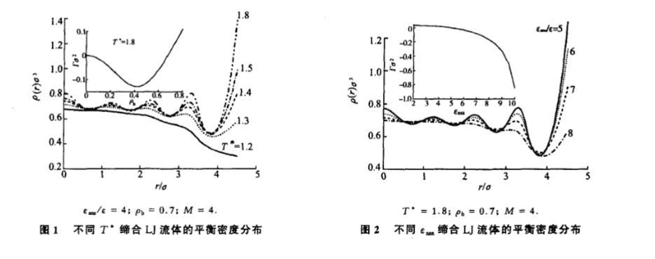 其中 R=σ/2 为分子半径,Rs 为球腔半径。在 (8) 的基础上,利用迭代求解的方法便可得到体系在平衡态下的密度分布。一旦得到分子 的密度分布,很容易计算体系的界面张力 γ 和剩余吸附 Γ。