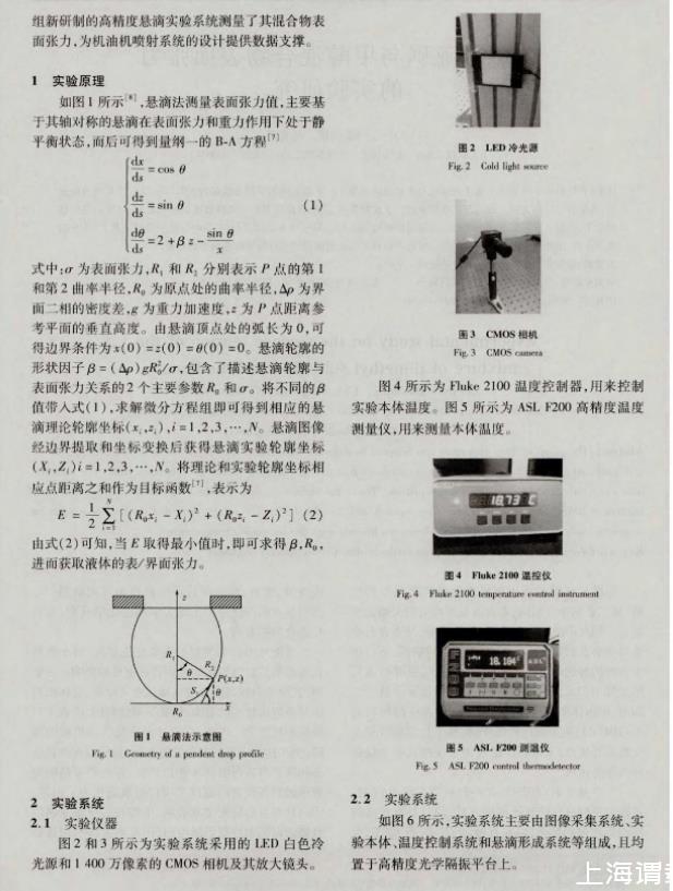 表面张力作为燃料的重要性能指标,对于燃料在发动机汽缸内的雾化过程有着重要的影响。一般地,表面张力较高会导致汽油机喷雾困难,液体燃料不易破碎成较小的液滴,延长了燃烧时间,降低了汽油机的热效率。因此,在设计和优化汽油机喷射器时,为了达到满意的雾化性能指标,以提高汽油机效率和降低有害污染物和颗粒排放,首先必须精确地获取燃料在较宽的温度范围内的表面张力。但是,国内外现有的研究文献表明,甲醇与二甲基亚砜混合物表面张力数据仍属空白,因此本文将利用课题新研制的高精度悬滴实验系统测量了其混合物表面张力,为柴油机喷射系统的设计提供数据支撑。