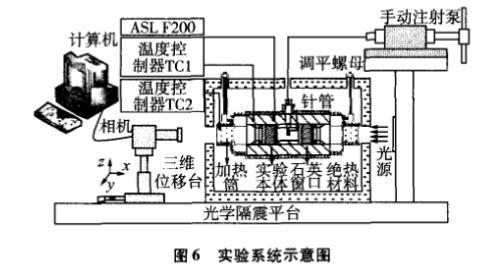 实验本体材料为316不锈钢,设计承压范围为0—20MPa,两端设计有法兰结构的观察窗。悬滴通过不锈钢针头形成,其端口平整,外径规格为(1.61±0.005)mm,内径为0.3mm,通过螺纹结构紧固于本体内。采用LED白色冷光源和1400万像素的CMOS相机及其放大镜头采集悬滴图像。实验本体温度采用电加热分段控制,在其非观察面上均匀缠绕电加热丝并利用Fluke2100温度控制器控制其温度,在观察窗两侧安装有加热筒,并控制加热筒的温度高于本体温度约5—10℃,防止在升温的过程中窗口结雾。实验系统的温度范围为20—180℃,温度波动度好于±10mK。本体温度采用ASL F200高精度温度测量仪测量,校准证书显示的全量程测温不确定度为±10mK,Pt100温度计由北京计量院标定,标定证书显示的不确定度为±5mK。因此,本文实验系统的温度扩展不确定度为±30mK(k=2)。实验本体通过螺纹杆悬至于环氧树脂保温箱体内部,并利用调平螺母调节本体的高度和水平,从而使其内部的针管处于铅垂位置并在相机视野的中心。待本体温度稳定30min后,开始采集悬滴图像,每滴采集10次,间隔为3s,至少采集3个悬滴共计30张图片,拟合计算并取平均值作为最后的实验结果。