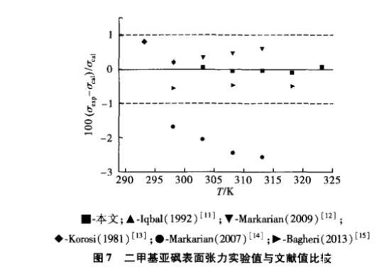 图7为二甲基亚砜表面张力实验数据拟合得到的方程与文献实验值的偏差。本文与Iqbal等[11],Markarian等(2009)[12]和Korosi等[13]毛细上升法测量的二甲基亚砜表面张力数据吻合较好,与Markarian等(2007)[14]数据偏差较大,最大偏差为2.57%。由图7可以看出Markarian分别在2007和2009年发表的数据偏差也较大。