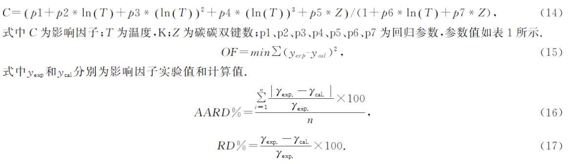 式中C为影响因子;T为温度,K;Z为碳碳双键数;p1、p2、p3、p4、p5、p6、p7为回归参数,参数值如表1所示。