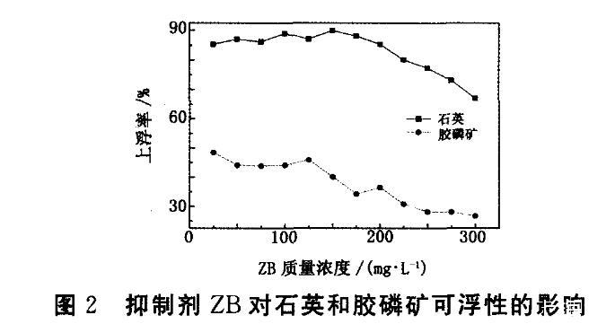 从图2看出,ZB对胶磷矿和石英的抑制效果明显,当ZB用量为150 mg/L时,两者上浮率差异达到最佳,为54.90个百分点。与图1对比可知,使用ZB做调整剂时,可在用量较低时得到更好的抑制效果。并对添加ZB后的矿浆pH值进行测定,当ZB用量达到150 mg/L时,矿浆pH为1.2左右;当ZB用量超过200 mg/L时,石英上浮率仍保持在70%以上,说明使用ZB不会造成石英上浮率明显下降,更有利于胶磷矿和石英的有效分离。