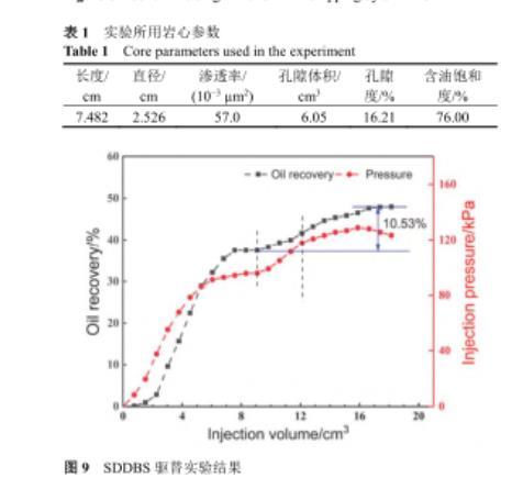 结合上述研究,选取0.02%(w)SDDBS溶液作为驱油剂进行岩心动态驱替实验.本实验使用的岩心参数如表1所示.驱替实验共分为三个过程:模拟地层水驱、表面活性剂驱、后续模拟地层水驱.驱替结果如图9所示,初期地层水驱,当采出液含水率>98%时,计算采收率为37.36%.当注入3.025 cm3 SDDBS溶液后采收率提高至41.67%,注入压力升高.恒温保持12 h后进行后续水驱,注入压力逐渐升高,且当采出液含水率>98%时,计算采收率为47.89%.说明SDDBS溶液驱在水驱基础上提高采收率10.53%,具有优异的驱油效果.