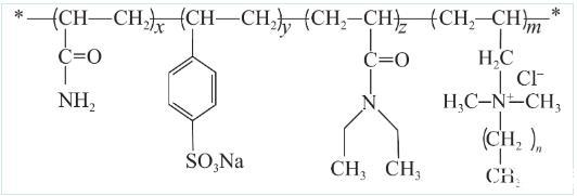 针对上述问题,亟需开发一种高耐盐、耐钙镁、耐剪切、低伤害的聚合物稠化剂,满足气田水、返排液规模化回用需求。研究表明,在分子结构中引入特定基团是实现聚合物功能化的常用方法,例如引入磺酸基提升耐盐性;引入刚性基团提高耐温耐剪切性能;引入阳离子基团能够减弱金属离子的屏蔽效应,提高聚合物耐温耐盐特性;引入双尾疏水单体可形成疏水微嵌段,溶解后有利于形成有序的多氢键结构体,可有效提高聚合物的耐盐和耐剪切性能,胶束结构受剪切破坏后,聚合物分子会迅速进行疏水缔合重排,发生二次聚集,具有一定的抗剪切自修复性。