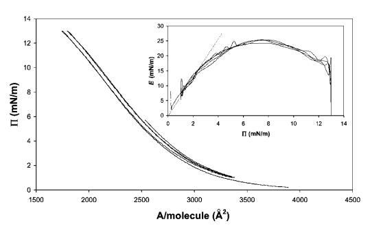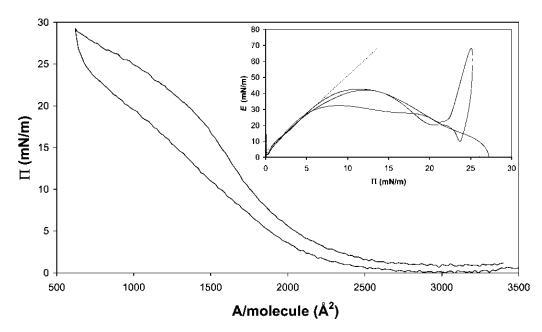 图7在20℃下测量的15 mg b-乳球蛋白在中性pH水上的P–A和(插图)E–P曲线。 插图中绘制的虚线表示E–P曲线的初始坡度。