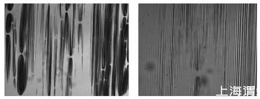 图5在透射光显微镜下,疏水蛋白在40 mN m-1下的压缩。左侧放大4倍,右侧放大10倍。