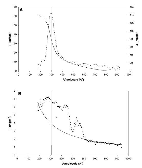 图3 HFBII的代表性压缩等温线,压缩量远低于每个分子的面积。 (A) P(-)和E(---)与每个分子的面积的关系。 (B) 摊铺量和压缩(Gcomp,-)预期的表面载荷,并通过椭偏仪(Gell,A)测量。