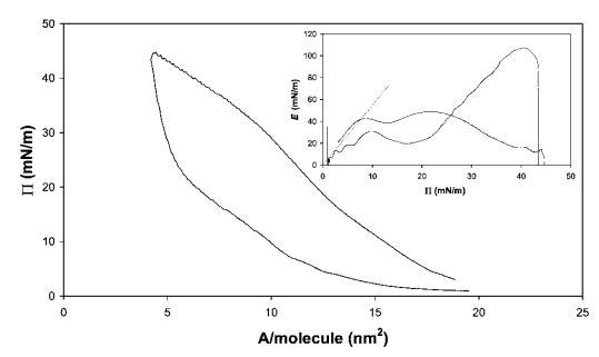 图6在20℃下测得的30 mg奎拉叶皂苷在中性pH水上的P–A和(插图)E–P曲线。插图中绘制的虚线表示E–P曲线的初始坡度。