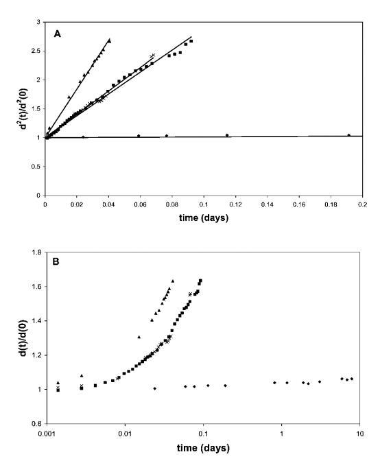 图1面板A显示了黄原胶溶液中50 vol%气泡的相对平方气泡直径d2(t)/d2(0)。 泡沫由含有0.1 wt%HFBII(A)、0.5 wt%b-lg(-)、0.1 wt%b-酪蛋白(:)和0.1 wt%Quillaja皂甙(*)的水溶液生成。 将所得泡沫转移到0.5 wt%黄原胶溶液中。 面板B以对数时间刻度显示整个时间间隔内的数据。