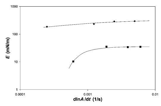 酪蛋白。 对于纯b-酪蛋白,再次观察到不同的行为(见图9)。 等温线的形状更平滑,没有观察到滞后现象。 观察到的斜率E/P为6.5,与之前报告的吸附层结果一致。43 E–P曲线表明,E的最大值约为25 mN m-1,之后观察到下降。 该结果与Rodriguez-Patino等人44和Hotrum等人41的早期测量结果一致。此外,E中并未明显反映出势垒方向的反转,这表明结构的松弛速度与势垒反转速度一样快,即约1秒。