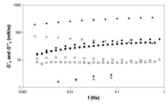 图11 HFBII(a)、b-乳球蛋白(-)、b-酪蛋白(:)和奎拉叶皂苷(C)的表面剪切储存(填充符号)和损失模量(开放符号)作为振荡频率的函数。