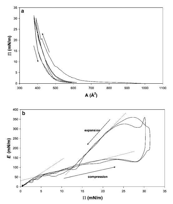 b-乳球蛋白。图7显示了b-乳球蛋白的压缩等温线。这条曲线远没有HFBII曲线陡峭,拐点更为明显。尽管在屏障运动逆转时观察到滞后现象。E–P曲线的初始斜率为4.3,远小于低P区的HFBII,表明b-lg分子在界面中相对较软。观察到E的平滑最大值为43 mN m-1,之后在进一步压缩至28 mN m-1时,不再检测到E的恢复。结果与早期的研究结果一致。40,41在屏障逆转时,观察到E的超调,再次表明结构无法适应突然膨胀和断裂。