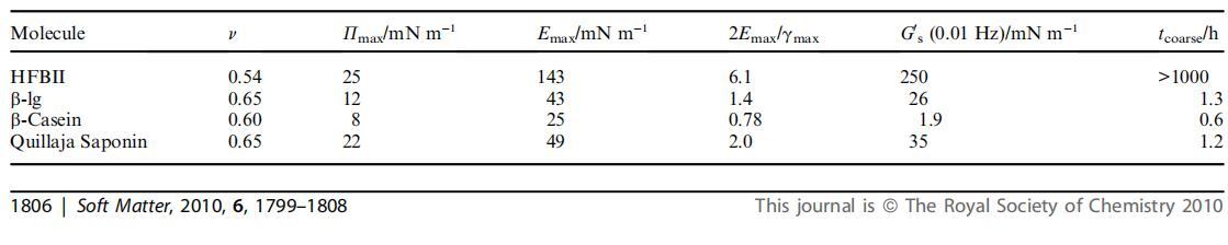 当蜜桃性爱视频网站现在再次考虑表1中的2Emax/gmax比率时,很明显HFBII超过了5的值,这表明这将稳定泡沫,防止收缩。 根据Kloek等人的说法,对于b-乳球蛋白和皂甙,蜜桃性爱视频网站报告的值介于1和2之间,表明气泡收缩延迟,但没有完全停止。2食品蛋白质通常属于这种状态,对歧化过程的抵抗力相对较小。10最后, 根据这个比率,b-酪蛋白根本无法抵消气泡收缩,因为2Emax/gmax<1,这是主要的吉布斯标准。
