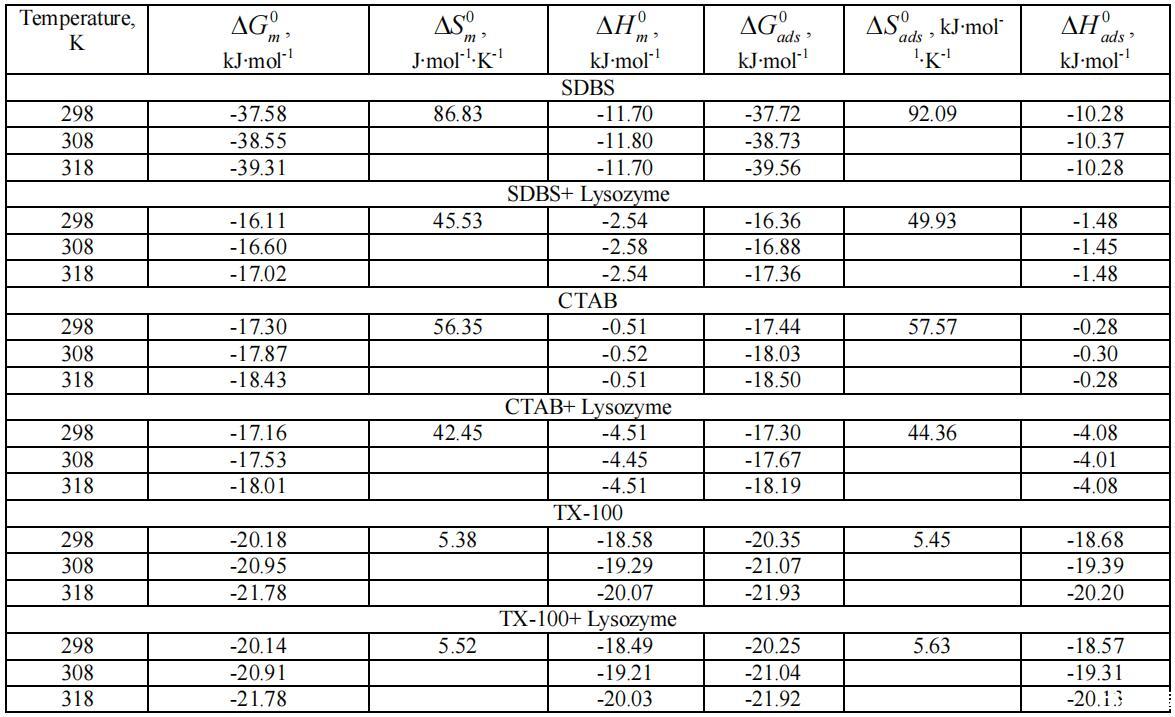 在溶菌酶存在和不存在的情况下,不同种类表面活性剂的物理化学和热力学性质如下所述: