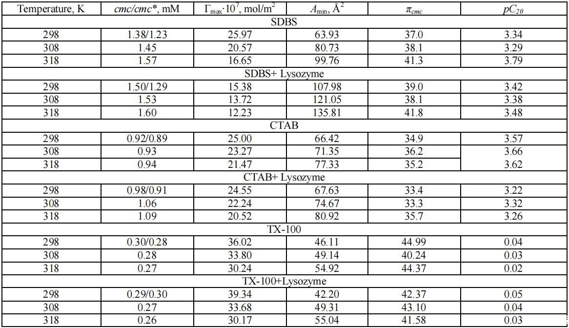 Γmax和Amin的值如表1所示。Γ最大值随着温度的升高而减小,其中随着Amin值的增加。因此,如果三种表面活性剂均为纯表面活性剂,并且存在溶菌酶,则这两个因素相互补充,这表明这些系统同时涉及静电和疏水作用[28]。在离子表面活性剂的情况下,与CTAB相比,SDBS的Γmax值下降更多,这表明SDBS和溶菌酶之间形成的复合物比CTAB和溶菌酶更有利。同时,阿明的增加与Γmax相反。