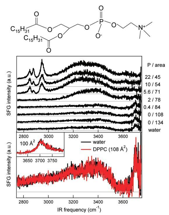 图1。顶板:DPPC的分子结构。中间面板:裸露水面(底部光谱)和密度增加的水中DPPC的SSP极化SFG光谱。压力(mN/m)和每个分子的面积(Å2)分别从底部到顶部增加和减少,在图表旁边给出。每个分子的面积由氯仿溶液滴的数量控制。CH(2800)−3000厘米−1),氢键OH(3000−3600厘米−1),还有免费的哦(∼3705厘米−1)拉伸振动可见。底部面板:从裸露水面的中间面板放大,每个分子的DPPC为108Å2,以表明它们的相似性。插图放大了裸露水面和DPPC(100Å2)表面的自由OH拉伸振动区域。在每个分子的这个区域,压力仍然低于检测极限,表面上DPPC的存在显然不影响自由OH拉伸振动的振幅。相对较高的红外通量(∼10 mJ/cm2)用于本实验。