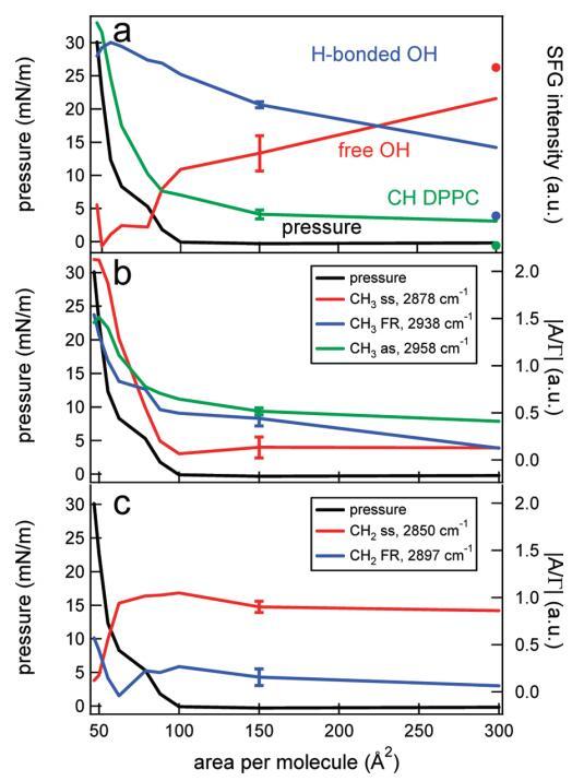 图6。(a)DPPC的CH信号(绿色)、Hbonded OH信号(蓝色)和游离OH信号(红色)的表面压力(黑色,左轴)和积分SFG强度(右轴)作为每个分子面积的函数。数据点是通过整合特定光谱区域获得的,该区域由图5的光谱中的彩色方块标记。纯水层的CH、OH和游离OH面积(在表面活性剂摊铺前测量)分别表示为绿色、蓝色和红色圆点。为清晰起见,集成SFG信号已被标准化,并且彼此略微偏移。(b)表面压力(黑色,左轴)和不同CH3共振(右轴)的绝对振幅/带宽比(|A/Γ|),通过使用洛伦兹线型模型拟合图5中的数据获得。(c)和b一样,但是对于CH2共振。典型误差条如图所示。