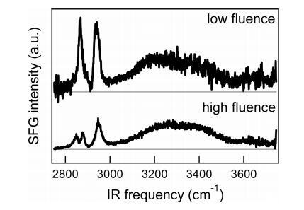图7。高密度水上DPPC的SFG光谱(SSP极化)(∼每分子45Å2)在低浓度下(∼1.5 mJ/cm2)和高通量(∼10 mJ/cm2),单脉冲加热量分别在0.3至3°C(取决于红外频率)和2至19°C之间。为了清晰起见,对光谱进行了偏移,并根据相对红外强度进行了缩放。注意,由于在高通量下发生的热效应,形状非常不同。这两种光谱都是用非旋转槽测量的。