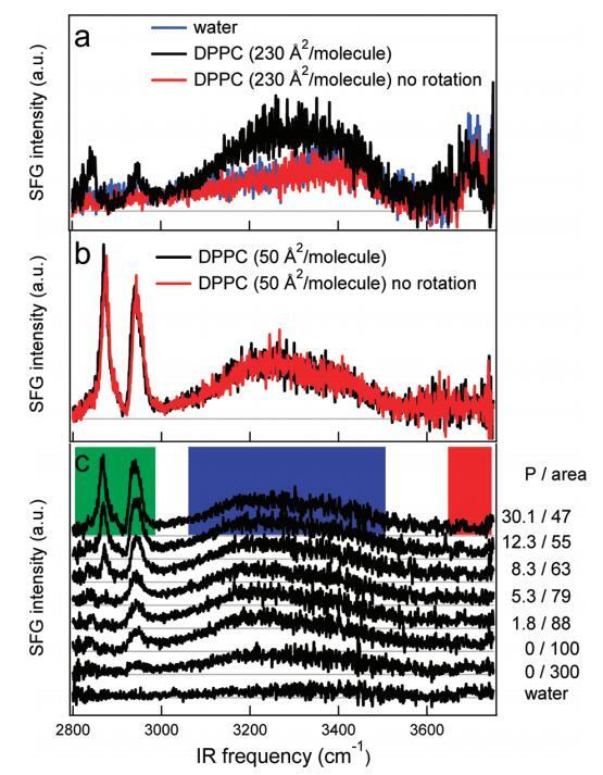 图5。(a)DPPC在水上以230Å2/分子(黑色)和不旋转(红色)槽的SSP极化的SFG光谱。样品以这样的方式旋转:在激光焦点处,样品以∼0.06 m/s。不旋转时,光谱与水相同−空中接口(蓝色)。(b)在高密度(每个分子50Å2)下,旋转(黑色)和非旋转(红色)之间没有区别。(c)裸露水面的SFG光谱(SSP极化)(底部光谱)和密度增加的水中DPPC的SFG光谱。压力(mN/m)和每个分子的面积(Å2)分别从底部到顶部增加和减少,在图表旁边给出。每个分子的面积由氯仿溶液滴的数量控制。彩色方块标记了图6中使用的积分区域。本实验中使用了相对较低的红外注量(1.5 mJ/cm2)。