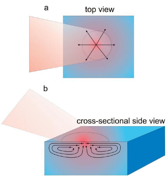 图4。水样近表面区域稳态加热引起的流动示意图。温度示意图上用颜色表示,其中红色表示热,蓝色表示冷。橙色阴影区域显示入射到表面的激光束,箭头表示温度梯度诱导流动的方向。(a)俯视图,显示近表面区域的径向位移,(b)横截面侧视图,显示产生的Marangoni流动单元。请注意,在焦点的中心,水流向上,因此表面可以有效地持续更新。