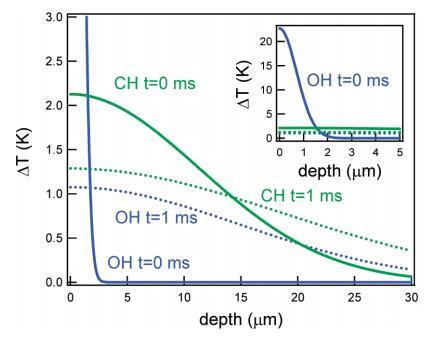 图9。对于与CH(绿色)或OH(蓝色)振动共振的红外光束,温度随着进入水层的深度而升高。实线和虚线分别表示t=0和t=1 ms。插图显示了相同的图形,但带有扩展的yaxis。