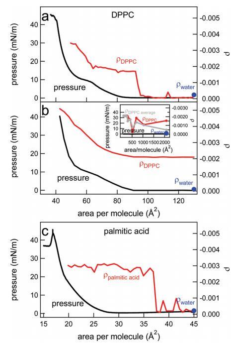 图8。(a)在制备单分子层后,通过快速添加DPPC溶液持续压缩单分子层,直到达到130Å2的每分子面积,水上DPPC的表面压力(黑色,左轴)和椭圆系数(红色,右轴)。(b)水上DPPC的表面压力(黑色,左轴)和椭圆系数(红色,右轴)是每个分子面积的函数。通过逐滴添加更多DPPC,每次滴加间隔几分钟,改变了该区域。以这种方式达到的每个分子的最小面积为2000Å2。插图显示了椭圆度系数(对于一个特定实验(红色)和三个实验的平均值(灰色))以及非常低密度下的压力。(c)在制备单分子层后,通过快速添加棕榈酸溶液,直到达到每分子45Å2的面积,连续压缩单分子层期间,水上棕榈酸的表面压力(黑色,左轴)和椭圆系数(红色,右轴)。在喷洒表面活性剂之前测量的纯水椭圆度在每个面板中以蓝色圆点表示。