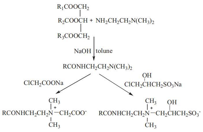 羧基甜菜碱和磺基甜菜碱表面活性剂OCB和OSB已通过两步程序成功合成,如方案1所示。第一步是以DMAEA为中间体,从橄榄油的甘油三酯中分离出单甘酯,制备橄榄油酰胺(OA)。第二步是OA分别与氯乙酸钠和CHPSNa进行季铵化。具体程序如下: