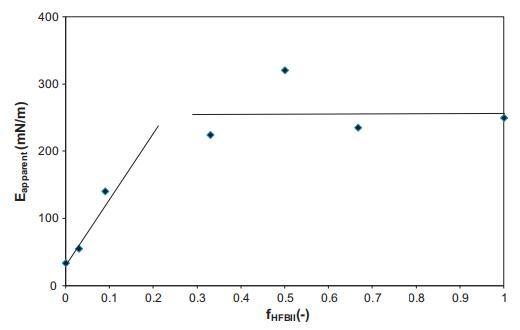 图6。表观模量E是WPI和HFBII混合溶液中吸附层HFBII分数的函数。