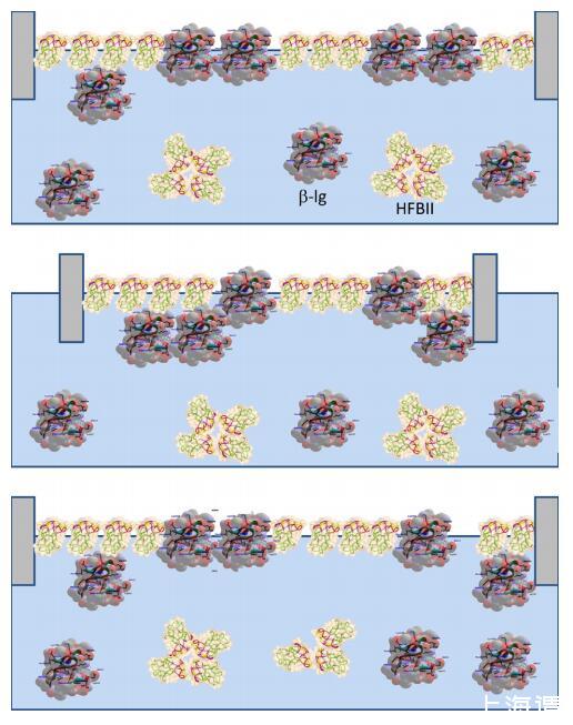 图7。重复压缩和膨胀后HFBII:WPI混合层结构形成示意图。请注意,乳清蛋白的主要成分BLG仅在此处显示。压缩:BLG的一部分从表面排出,形成一个子层。膨胀:BLG的一部分停留在亚表层,而另一部分可能重新吸附到主层。顶面存在HFBII的净浓度。