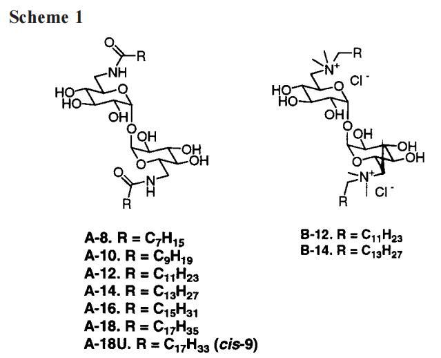 本文研究以海藻糖为间隔基的双子座(方案1)。A系列由海藻糖组成,其6-和6′-羟基被长链酰胺取代。B系列在6-和6′位置有长链季铵盐基团。蜜桃性爱视频网站选择海藻糖作为糖间隔物并不是随意的。首先,海藻糖是一种双糖,允许两条烃链相隔相当长的距离。双子座中受限的分子内链/链相互作用是一种结构特征,过去仅对其进行了简要研究。15秒后,海藻糖(一种从细菌、藻类、昆虫和植物等多种自然来源中分离出来的糖)可以保护生物膜免受脱水的压力。16因此,在生物膜的“细胞模拟”建模方面,蜜桃性爱视频网站对海藻糖双子感兴趣。17第三,从实用的角度来看,海藻糖很有吸引力,因为它包含两个完全相同的D-葡聚糖单元。这简化了化合物的合成和分析,与大多数其他双糖相比,化学性质不同的羟基数量减少了一半。但尽管对称,合成纯海藻糖双子座的途径(方案2和方案3)无疑是随后物理化学的一个乏味的序言。