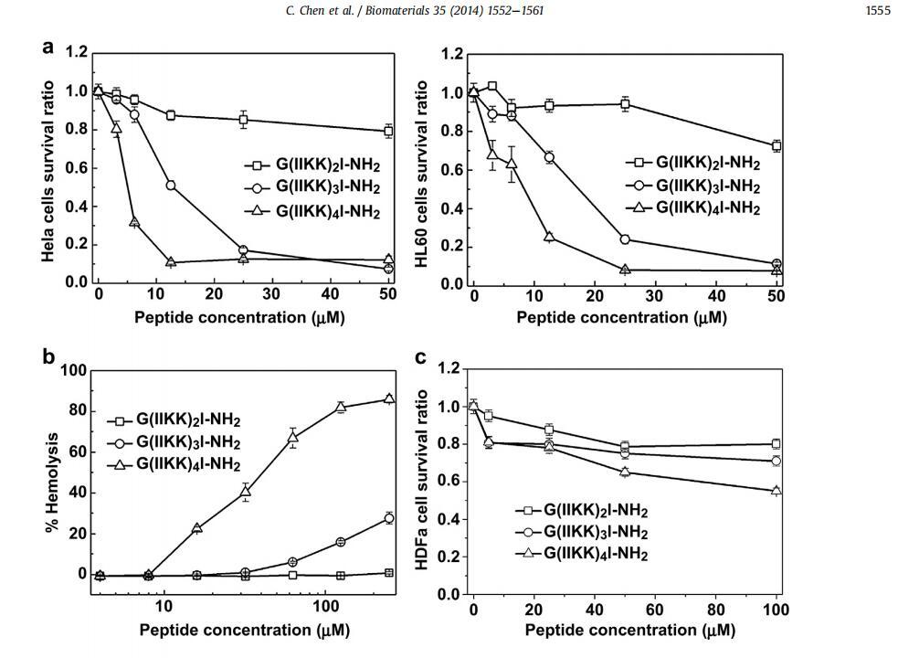 一段时间以来,天然抗菌肽(AMPs)及其合成类似物一直被视为新抗生素的潜在来源。AMP对广泛的微生物表现出不同的抗菌活性,有趣的是,其中一些还表现出对癌细胞的毒性,但对正常哺乳动物细胞的生物相容性程度不同[2e4]。此外,由于这些AMP主要通过非受体介导的途径作用于靶细胞膜,与传统化疗药物相比,癌细胞更难产生耐药性[3,4]。由于这些理想的特性,研究和开发具有癌细胞毒性的AMPs可能会在开发更好的抗癌药物方面取得进一步进展。短的线性阳离子AMP在与其靶相互作用时折叠成两亲构象,代表了抗菌肽的一种特别成功的结构安排[5e7]。为了提高其在治疗应用中的前景,并研究结构活性关系,已经设计和合成了许多类似物,以模拟天然AMPs的特征,并有不同的成功报道。主要障碍在于调整针对宿主细胞的毒性的效力。