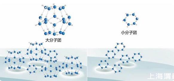 科学家近些年通过研究发现,气态的水可以假设为单个水分子或者是二聚体水分子;处于液相与气相过渡状态的水分子可能会有简单的三元、四元、五元甚至六元环形分子存在;液相水分子团的结构要大于液相与气相过渡状态的水分子,会有六元、七元、八元甚至是更大的分子团存在。当分子簇大于7以后已经不大容易形成单个的环状分子簇了,即便可以勉强形成大环分子状态上也十分不稳定,很快便会通过变形转化成折叠形态或多环结构。与高分子不同的是由于水分子之间并没有形成共价键而是以氢键相连,因而这种分子链在液态时十分脆弱,应该处于动态下的不断断裂和组合过程中。