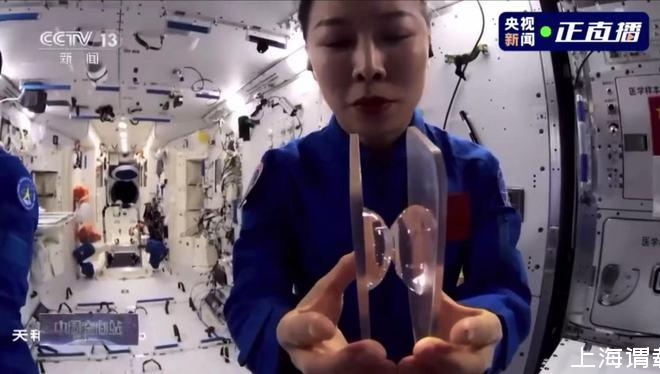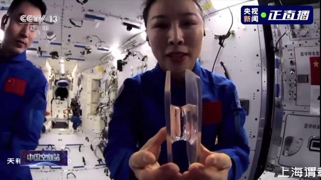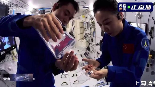 由叶光富将航天员平时所喝的饮用水慢慢倾倒在液桥板上。