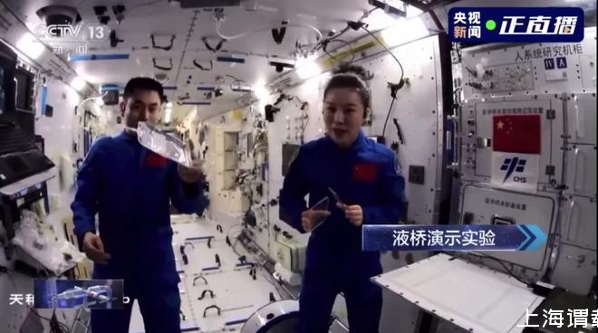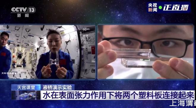 王亚平解释,在地面重力的环境下,水的表面张力微不足道,所以同学们无法用纯水做出一个液桥。而在太空中,由于重力消失,液体表面张力就可以用液体搭建出一座桥。