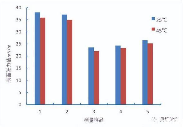 采用铂金环法,分别在25℃和45℃的温度下测量五种油墨的表面张力值。