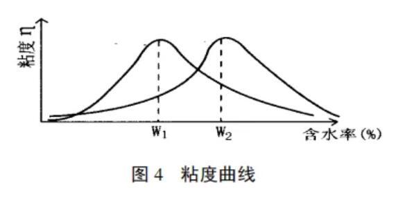 含水量高则流动性好(即每个颗粒表层水膜厚),但凝聚性差,坯体易变形。因此,对每一企业来讲,在原料处理、挤泥机等条件固定的前提下,摸索一个合适的成型含水率,既利于挤泥机成型,又利于砖坯强度。根据蜜桃性爱视频网站对几十种黏土的试验数据,每种黏土都有一个最佳含水率,在这种含水率的情况下,黏土的粘性(稠度)最好。典型的粘度曲线(见图4):