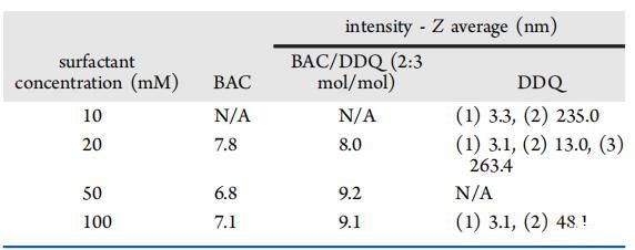 光子相关光谱(PCS)用于测定胶束的流体动力学直径。BAC和BAQ/DDQ 2:3 mol/mol的PCS分布图(图1b)显示了在相关浓度范围内的单峰分布,平均Z平均值和单峰分布表明存在椭球或球形胶束几何结构。DDQ呈现双峰/三峰分布,表明胶束结构具有较大的聚集数(表4)。这可以用具有径向长度和轴向长度的圆柱形几何体或与单分子或多分子囊泡平衡的球形胶束来解释。28这两种情况与早期DDQ荧光探针研究的结果一致,该研究观察到胶束聚集数从20增加到86,浓度从10增加到81 mM。29