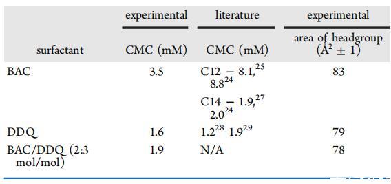 表3:。空气中BAC、DDQ和BAC/DDQ 2:3 mol/mol的表列CMC和每人头群表面积值−25°C时的水界面