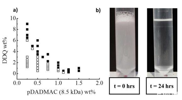 图2:。(a)25°C下pDADMAC(8.5 kDa)/DDQ/水的相分离边界:(□)单相和(■)两个阶段。(b)样品pDADMAC(3 wt%)/DDQ(3 wt%)/水的相分离图像(t=自上次搅拌以来的时间)。