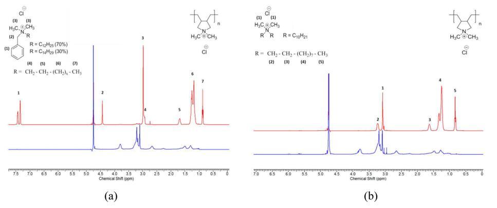 图3:。样品顶相和底相的1 H NMR:(a)pDADMAC 8.5 kDa(3 wt%)/BAC(3 wt%)/水样和(b)pDADMAC 8.5 kDa(3 wt%)/DDQ(3 wt%)/水样,自上次搅拌后24 H。(红色)顶相(表面活性剂)和(蓝色)底相(pDADMAC)。