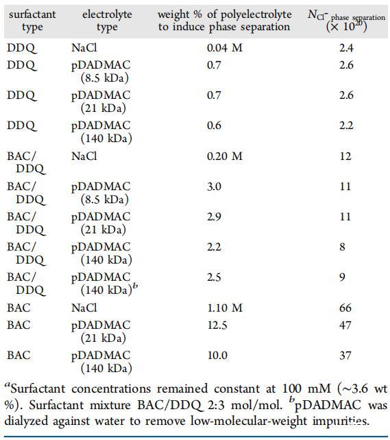观察到显示分离相分离的NaCl/表面活性剂/水混合物,以产生富含表面活性剂的上层相,类似于聚电解质/表面活性剂/水混合物中的相分离。这说明,对于pDADMAC(21 kDa)和NaCl系统,可以通过改变BAC/DDQ的比率来控制相界。