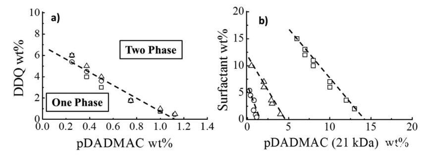 图4:。(a)pDADMAC/DDQ/水的相分离边界作为pDADMAC分子量的函数:(□)8.5 kDa(○)21 kDa和(Δ)140 kDa(25°C时)。(b)pDADMAC的相分离边界(21 kDa)/表面活性剂/水(○)DDQ(□)25°C下的BAC和(Δ)BAC/DDQ(2:3 mol/mol)。虚线表示相界的大致位置。