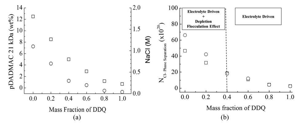 图5:。(a)临界相分离浓度与BAC/DDQ质量比的函数关系。表面活性剂(BAC/DDQ)浓度保持恒定(100 mM≈3.6 wt%):(○)NaCl和(□)pDADMAC(21 kDa)。(b)诱导相分离所需的电解液中氯离子的数量(NCl−相分离)作为BAC/DDQ比的函数。表面活性剂(BAC/DDQ)浓度保持不变(100 mM/≈3.6 wt%)。电解液类型:(○)NaCl和(□)pDADMAC(21 kDa)。