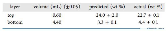 表5:。最后一次搅拌后24小时pDADMAC 8.5 kDa(3 wt%)/DDQ(3 wt%)/水的顶层和底层重量分析