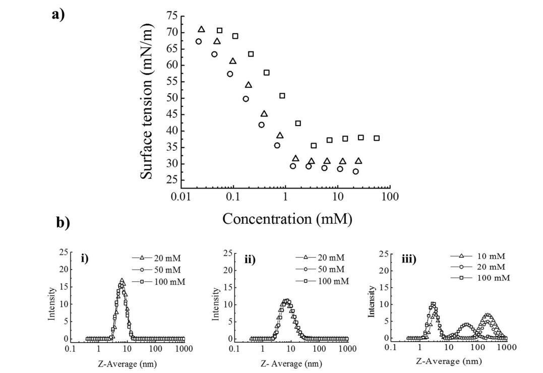 图1:。(a)25°C水中的表面张力曲线(□)美国银行(○)DDQ和(Δ)BAC/DDQ(2:3 mol/mol)。(b)25°C下的PCS强度曲线随浓度变化:(i)BAC(0.3 M NaCl),(ii)BAC/DDQ 2:3 mol/mol(0.05 M NaCl),和(iii)DDQ(5×10−3 M NaCl)。