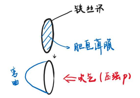 这时,咱们在一侧吹气(相当于施加了一个压强),平整的薄膜就发生“弯曲”——